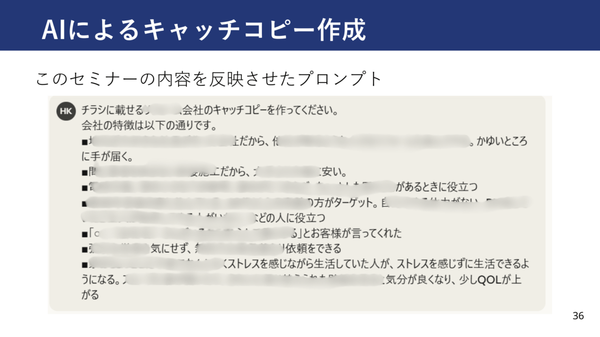 最後のほうに、セミナーの内容を反映させたプロンプトで生成させたキャッチコピーと、会社概要だけを入力したプロンプトで生成させたキャッチコピーを比較。プロンプト次第で結果がまったく違うことを体感してもらいました。
